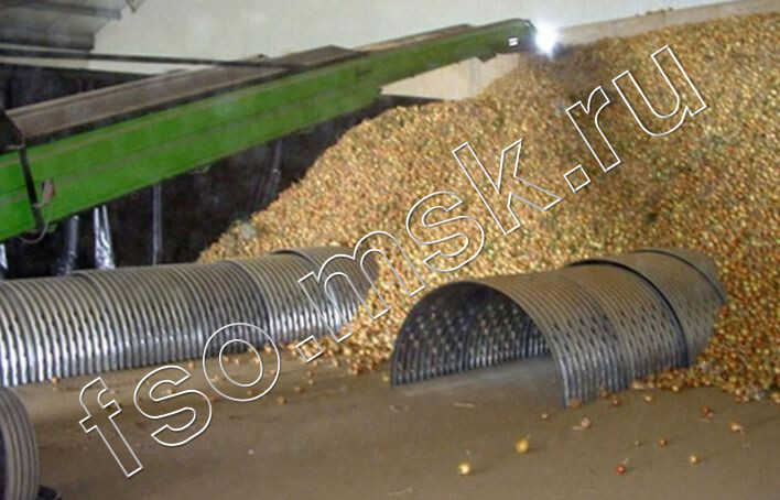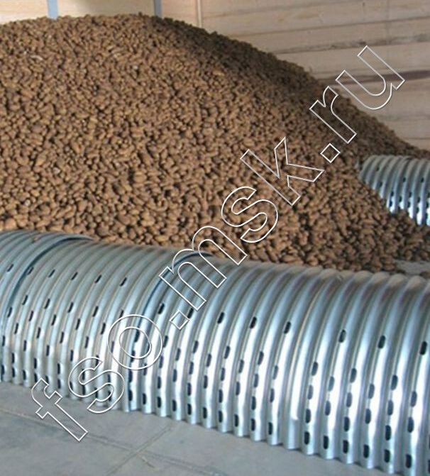 Вентиляционные каналы — это перфорированные трубы, предназначенные для движения воздушных масс в системе внутренней вентиляции овощехранилища и зернохранилища. В стенках каналов сделаны отверстия для движения воздуха, поддержания необходимого режима температуры и влажности. Данная конструкция обеспечивает оптимальный обдув овощей, зерна, позволяет удобно располагать каналы в нужных участках (в том числе в труднодоступных местах) с учётом особенностей помещения.